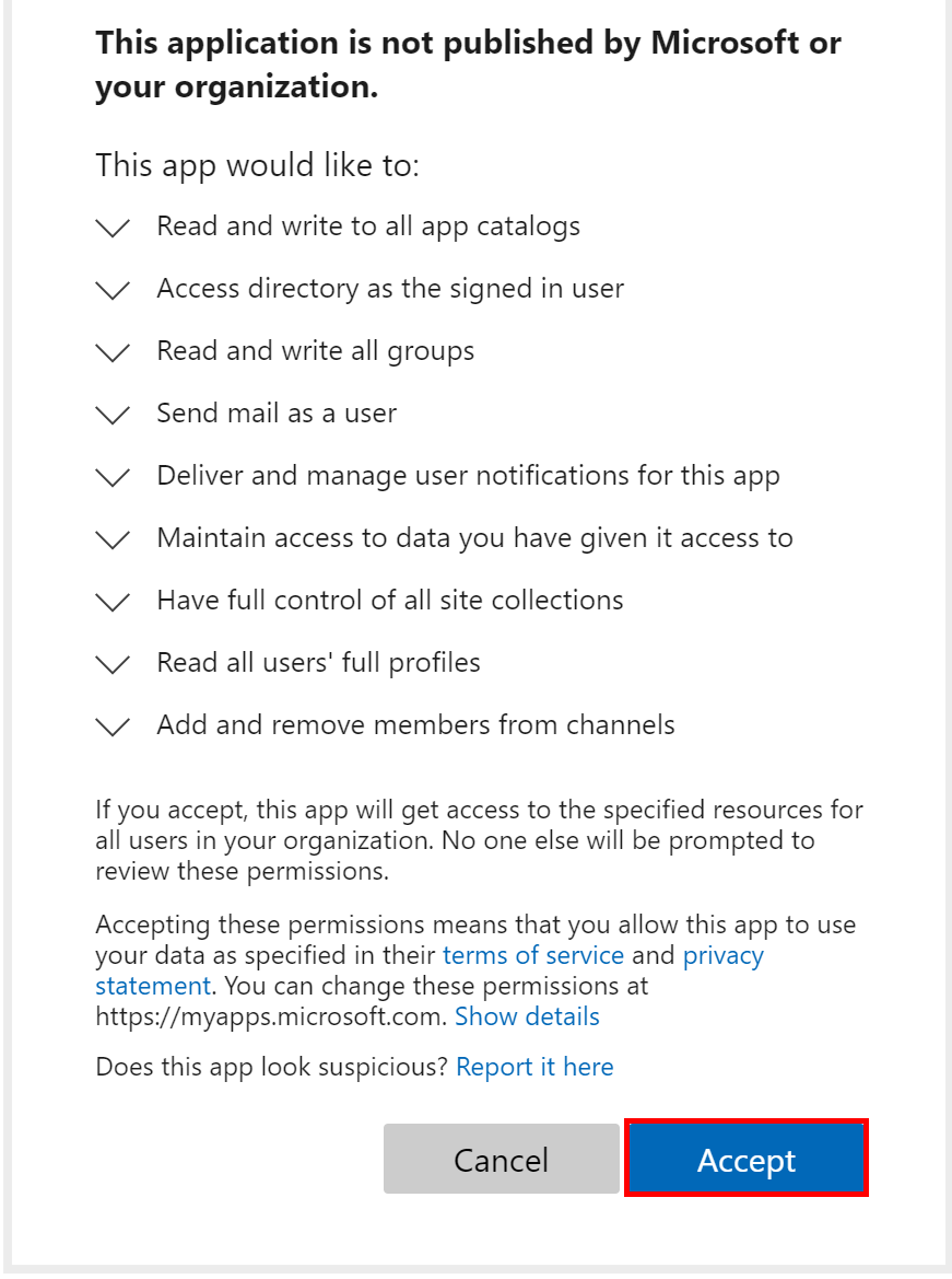 Sign in with your Microsoft 365 account from your organization that is granted the Global Administrator role. Check the permissions, and don't forget to check the Consent on behalf of your organization option. Finally, click Accept.
