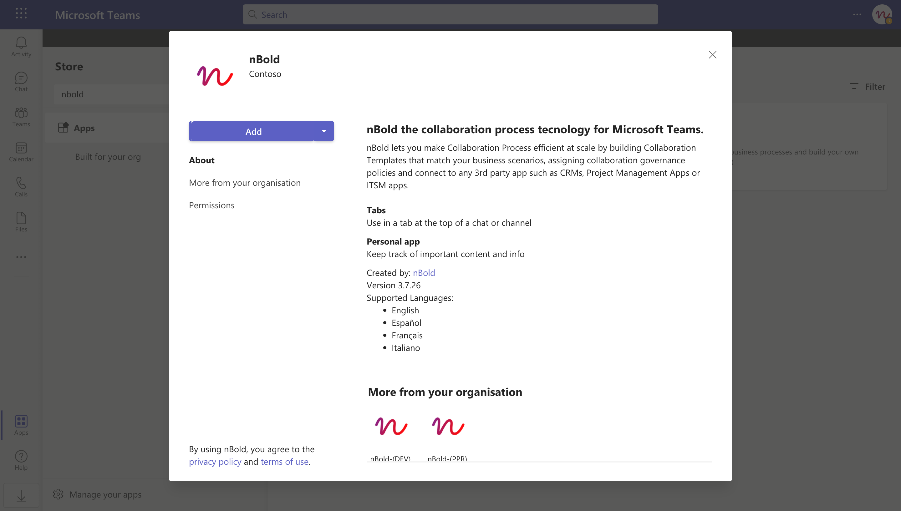 This "standalone" package is a personal Microsoft Teams app comprised of the following tabs (Home, Catalog, Settings, Docs), that you can manually upload to your Microsoft Teams App Catalog: 📦 nBold Standalone