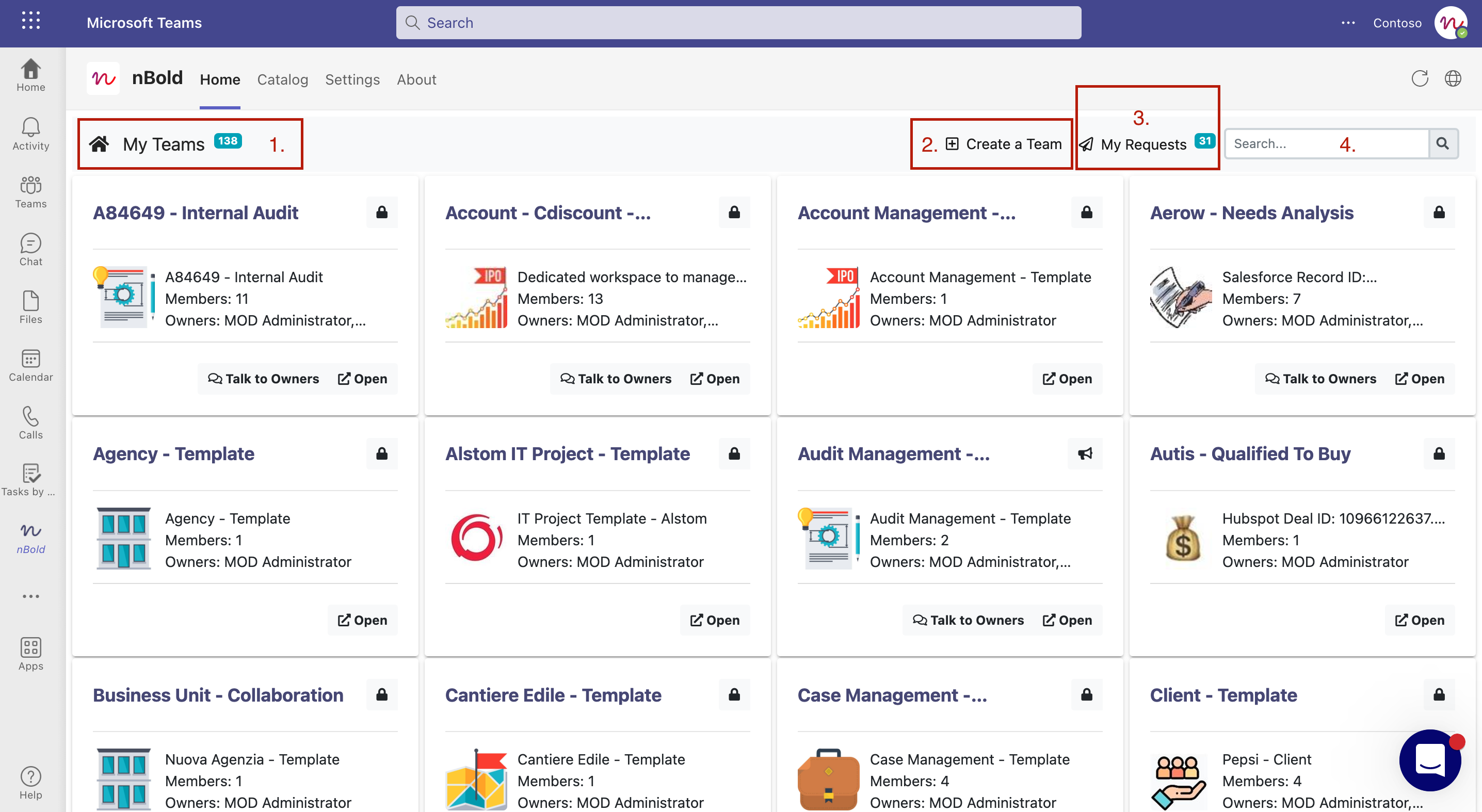 When you log in to nBold, you will by default land on the "Home" Tab. Here, you will be able to see all the Teams that you will create in the future or the existing ones. This tab is the same as the "Home App" which you will set up for end users and pin to the left pane.