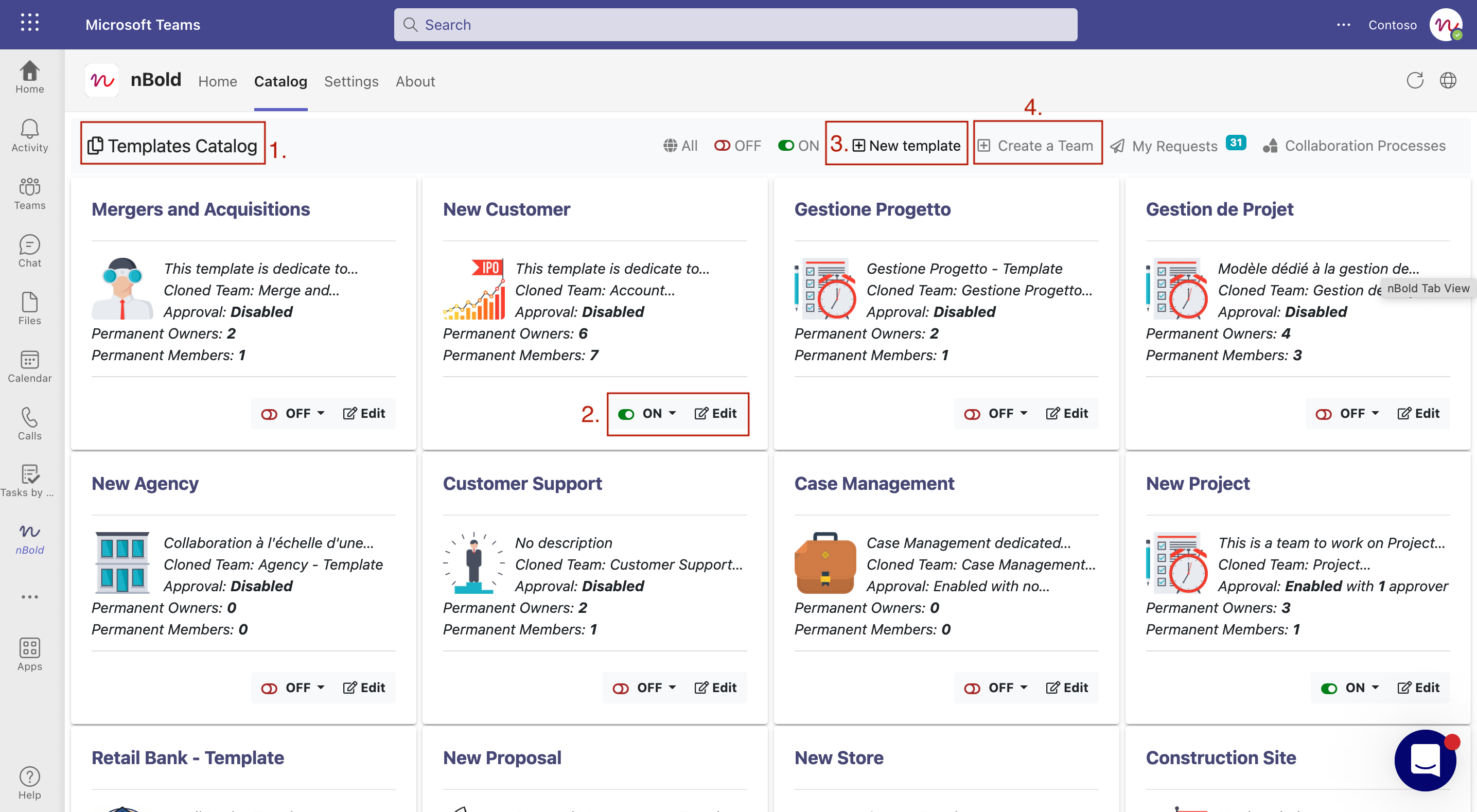 The "Catalog" gathers all the Templates defined for your organization. You can manage your Corporate Catalog of Collaboration Templates. These Templates enable you to ensure a strong Teamwork adoption and set up a differentiated Governance at the template level.
