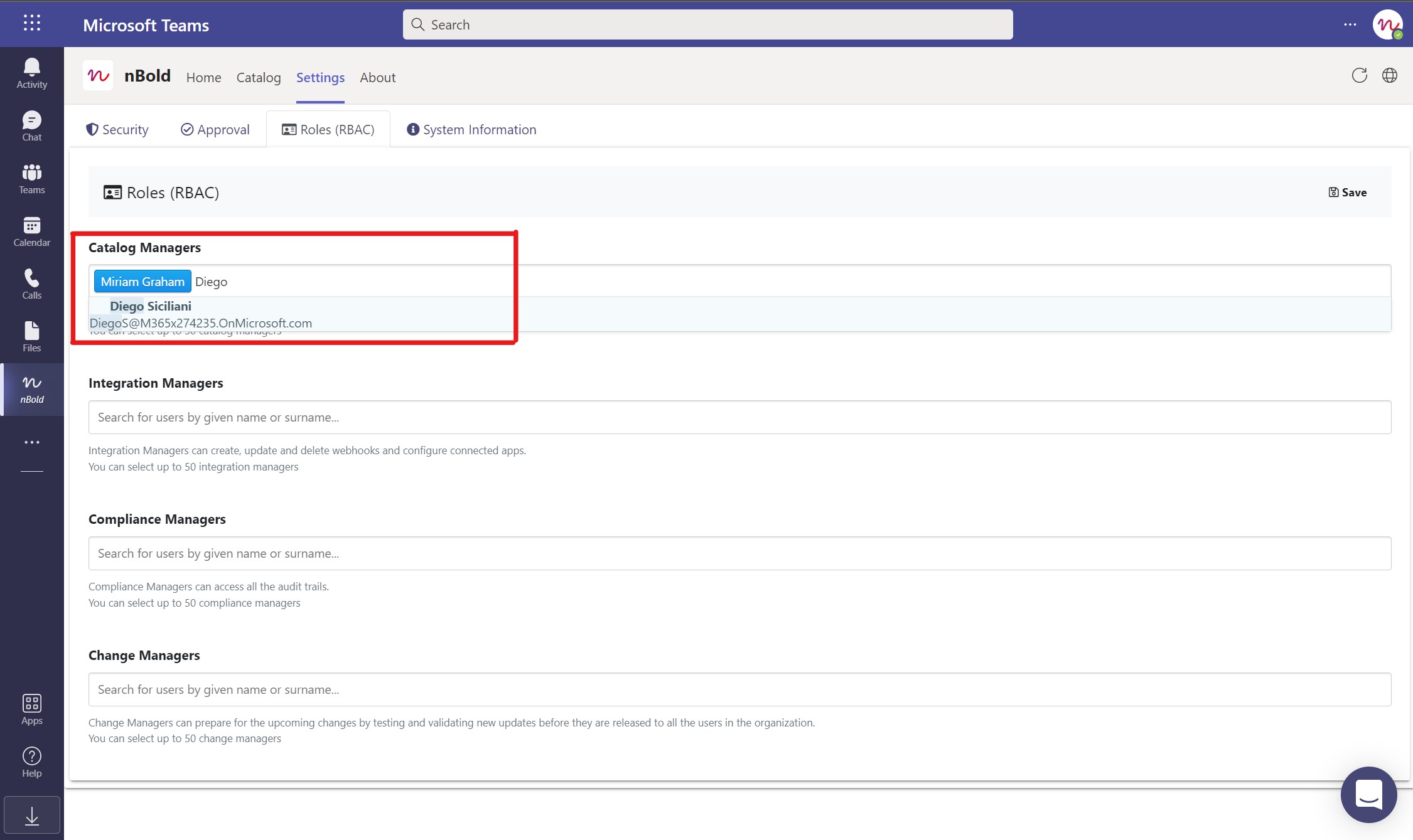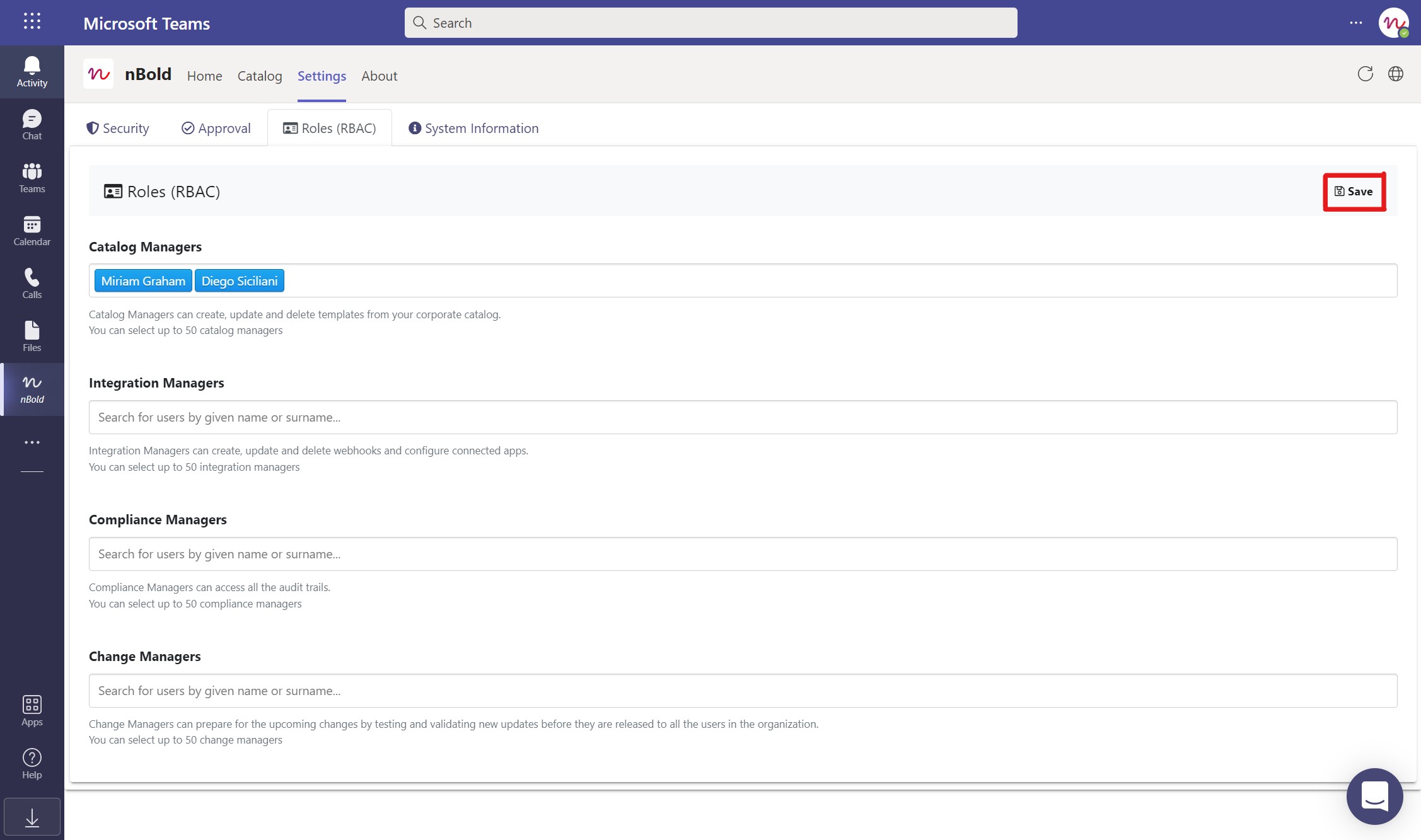 1. As a Microsoft 365 Administrator, connect to the nBold app, open the Settings tab, and navigate to the RBAC section: