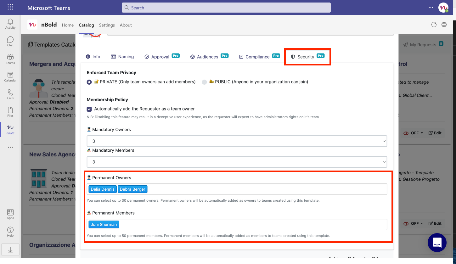 Permanent Owners and Private Channels: if the template includes Private Channels, Permanent Owners are added as Private Channels Owners by default when the team is created.