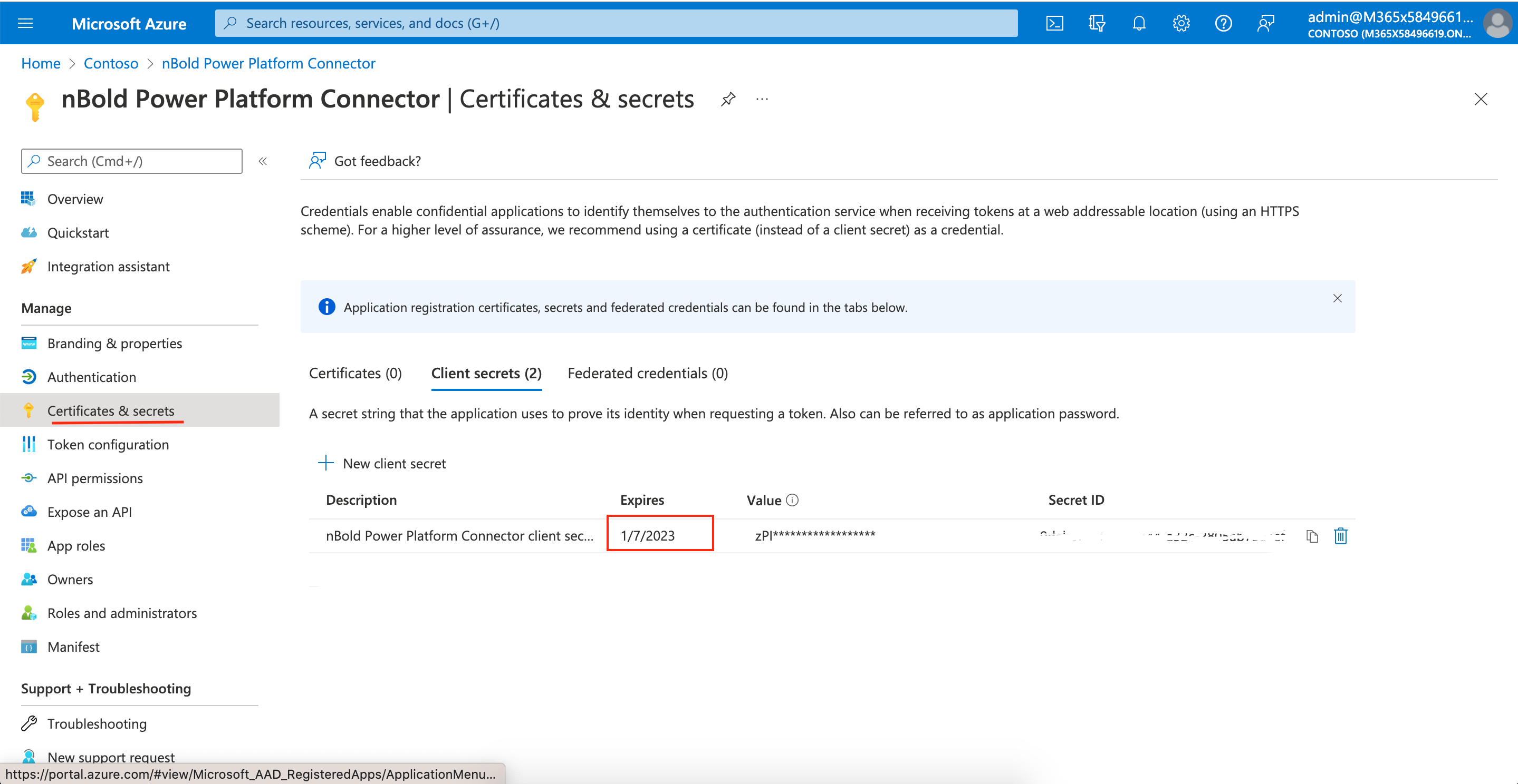 - Click on Certificates & Secrets and check if your client secret has expired.
