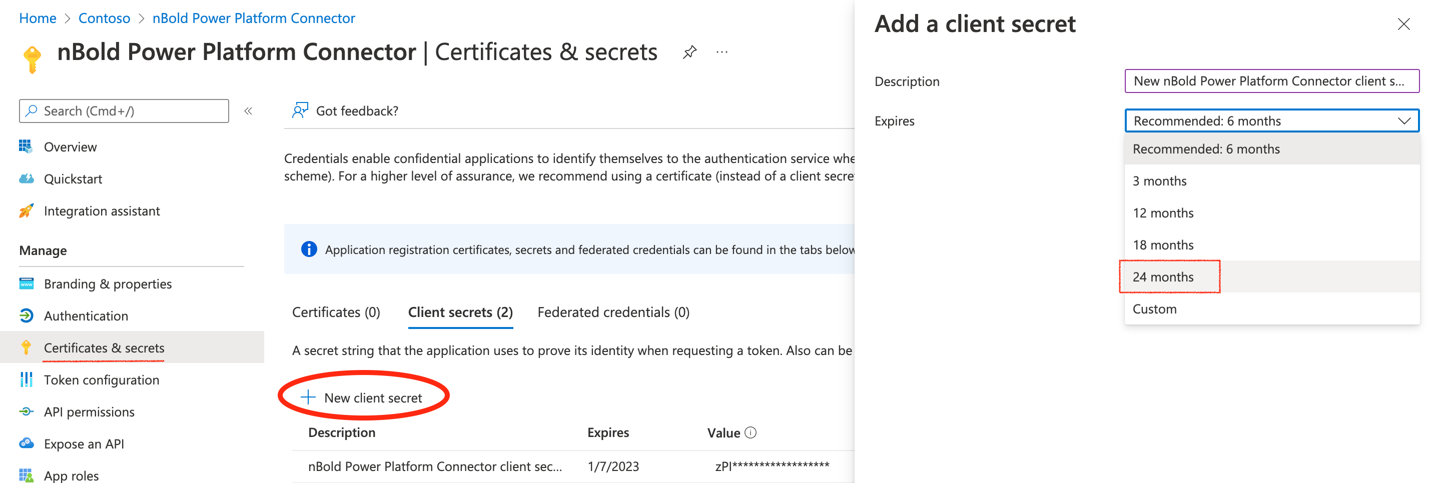 Certificates and secretsmenu and clickNew client secret. A client secret is a kind of a password for your app, so manage it carefully. - Give a name to your client secret such as: